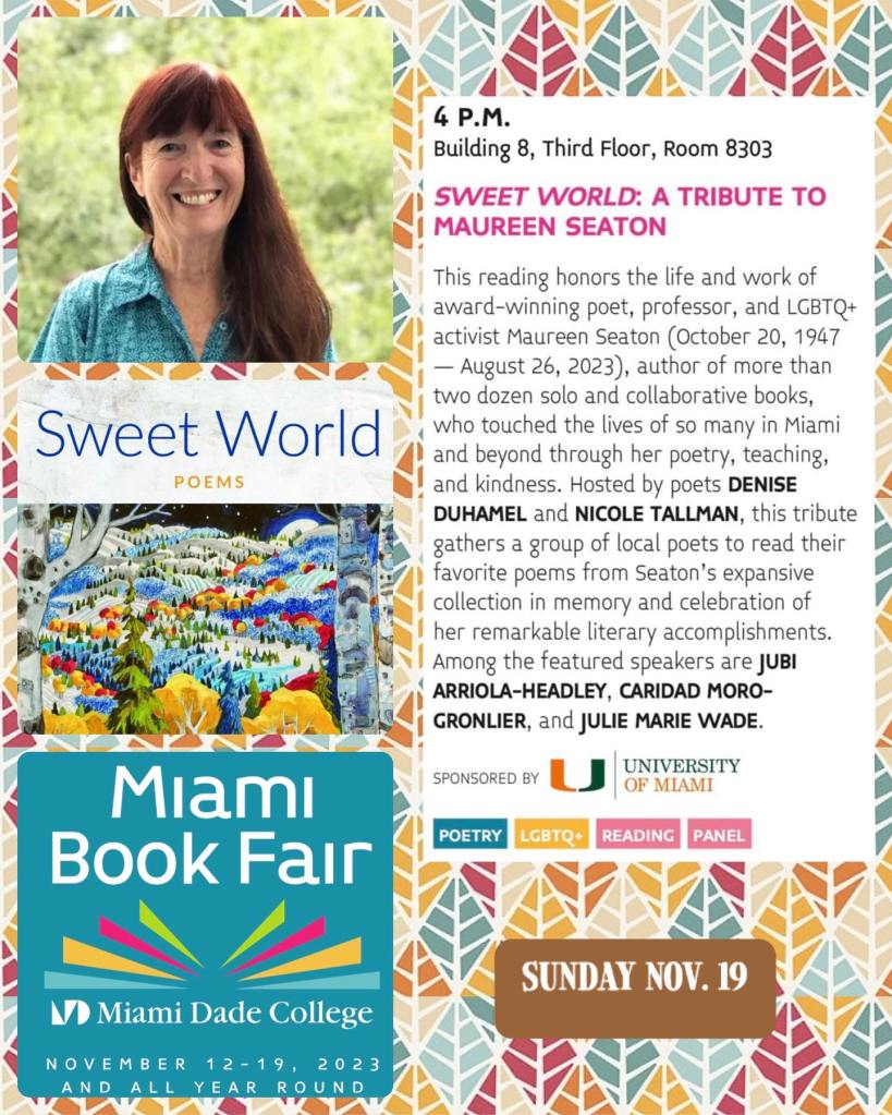 This reading honors the life and work of award-winning poet, professor, and LGBTQ+ activist Maureen Seaton (October 20, 1947 – August 26, 2023), author of more than two dozen solo and collaborative books, who touched the lives of so many in Miami and beyond through her poetry, teaching, and kindness. Hosted by poets DENISE DUHAMEL and NICOLE TALLMAN, this tribute gathers a group of local poets to read their favorite poems from Seaton’s expansive collection in memory and celebration of her remarkable literary accomplishments. Among the featured poets are JUBI ARRIOLA-HEADLEY, CARIDAD MORO-GRONLIER, and JULIE MARIE WADE.